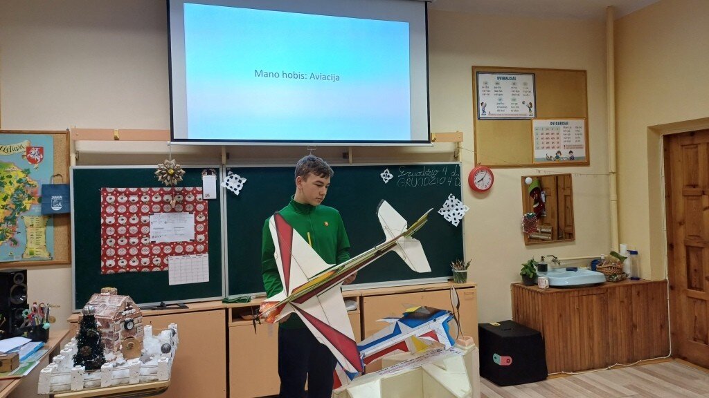 Pažintį su piloto profesija gilinome į pamoką pasikvietę buvusį „Santarvės“ pradinės mokyklos, dabar „Ąžuolo“ gimnazijos 1b kl. mokinį Eiviną Sinkevičių – įvairių šalies ir tarptautinių vaikų aviacijos sporto varžybų dalyvį ir prizininką. Eivinas pristatė savo pomėgį – aviamodelių konstravimą ir jų valdymą: šiam pomėgiui reikalingas priemones, papasakojo apie savo dalyvavimą varžybose, jų eigą bei vertinimo kriterijus, parodė varžybose pelnytus apdovanojimus, aptarė būtinas asmenines savybes. Svečias parodė savo sukonstruotus aviamodelius, pademonstravo jų skraidymą, kas sukėlė itin didelius mokinių plojimus, paaiškino, kaip skrydis valdomas pultu.