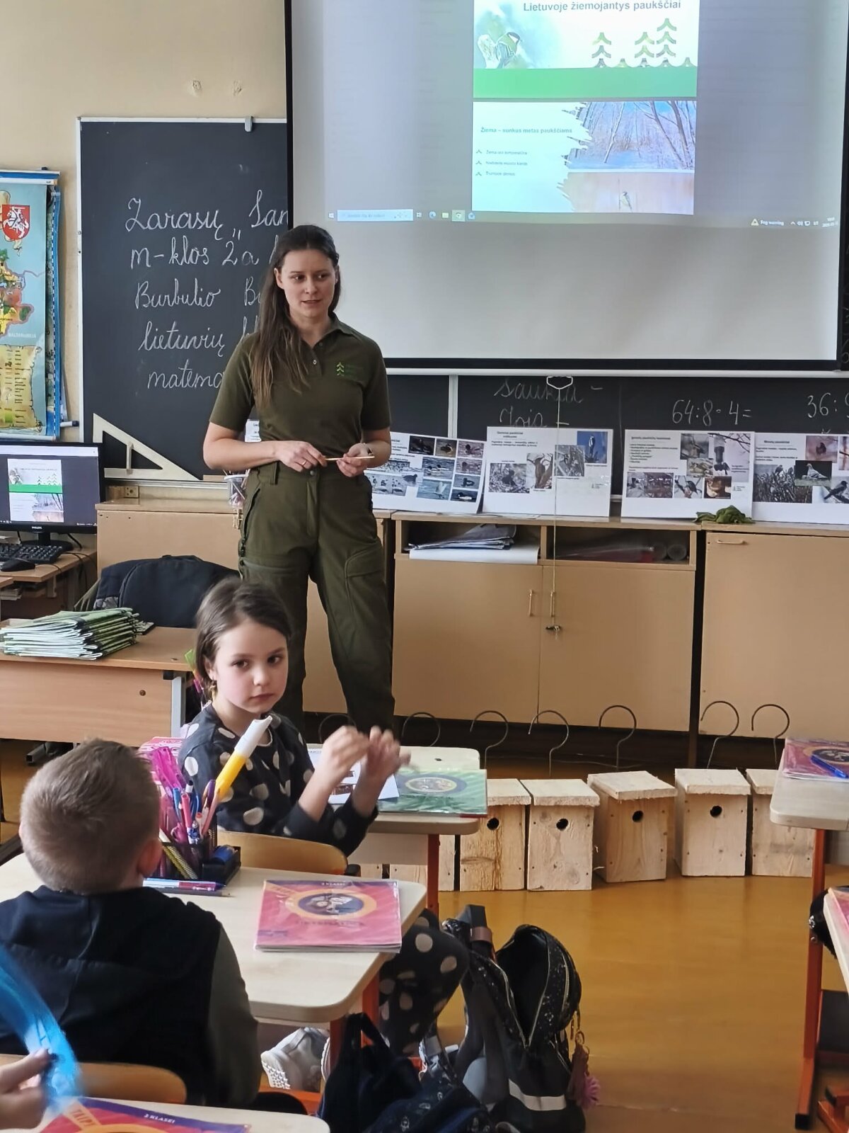 Pamoką padėjo pravesti 2a klasės mokinio Giriaus mama Evelina Mickevičienė, VĮ Valstybinių miškų urėdijos medienos ruošoš ir prekybos vadovė, kuri mielai pasidalijo savo žiniomis apie mišką ir paukščius bei padėjo mokiniams praktiškai prisidėti prie gamtos puoselėjimo.