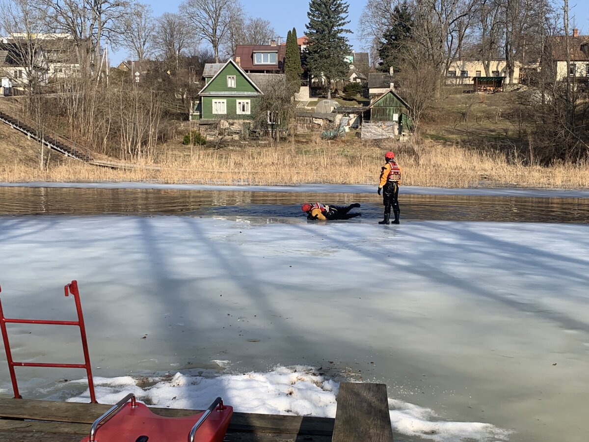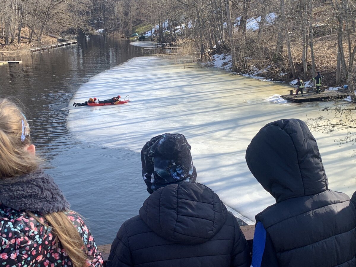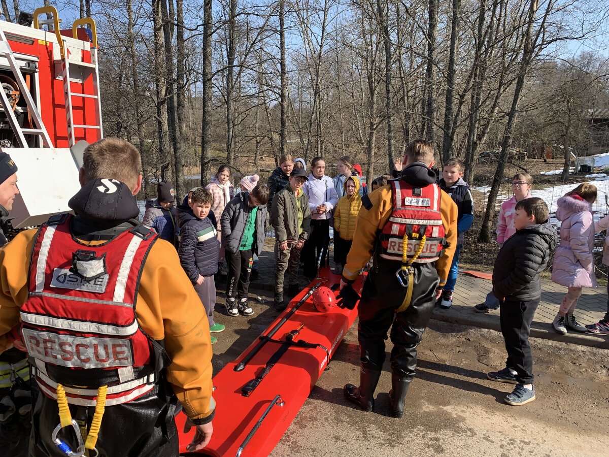Ugniagesiai paaiškino, koks ledo storis laikomas saugiu, ir kodėl vien tik išvaizda pasitikėti negalima. Mokiniai taip pat pamatė, kaip gelbėjami įlūžę žmonės naudojant specialią gelbėjimo įrangą.