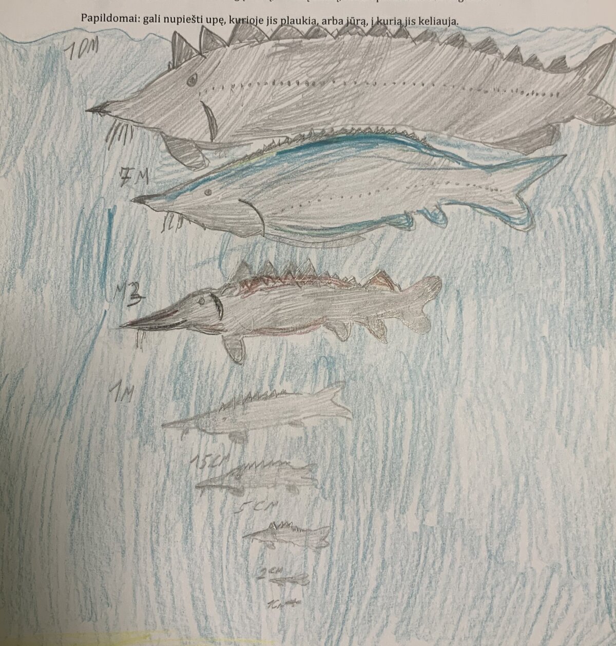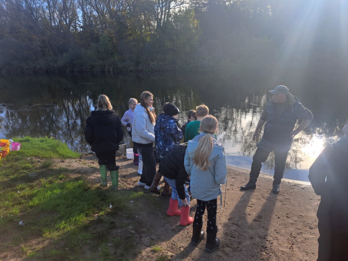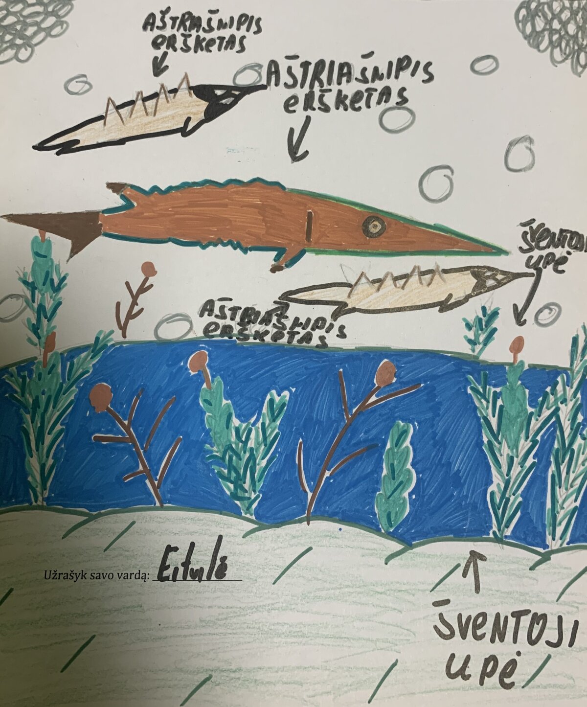 Spalio 14 dieną Žuvininkystės parke vyko integruota 4a klasės pamoka, įgyvendinama pagal Tūkstantmečio mokyklų projekto 64 programą „Kūrybinės laboratorijos – veiklų integravimas ir profesinis ieškojimas, kultūra ir tarpdalykinė integracija“. Žuvininkystės tarnybos prie LR ŽŪM Žuvivaisos departamento Žuvų išteklių atkūrimo skyriaus specialistai spalio 14 d. pakvietė 4a kl. mokinius dalyvauti „Aštriašnipių eršketų žuvinimo“ veikloje, kuri vyko Šventosios upėje ties Vidiškiais ir Zujais. Tą dieną paleidome 10000 aštriašnipių eršketukų, kurie specialiuose konteineriuose buvo atgabenti iš Rusnės. Mokiniai turėjo galimybę iš arti stebėti žuvų išteklių atkūrimą, susipažino su nykstančia žuvų rūšimi, sužinojo apie žuvivaisos specialistų darbą ir praturtino gamtamokslines žinias realioje aplinkoje. Tęsiant veiklas, ugdymas buvo integruotas su projekto partneriu – Zarasų meno mokykla. Dailės mokytoja P. Sekonienė vedė kūrybines dirbtuves, kurių metu mokiniai piešė savo svajonių žuvis, kūrė menines kompozicijas ir mokėsi kūrybinėmis priemonėmis perteikti ekologines temas. Tokia veikla padėjo mokiniams lavinti vaizduotę, meninę raišką ir suprasti, kaip kūryba gali būti siejama su gamtosauga. Vėliau pamoka buvo tęsiama tarpdalykinėje integracijoje su anglų kalbos mokytoja J. Lizunoviene: mokiniai pristatė savo piešinius anglų kalba, mokėsi apibūdinti kūrybą, vartoti su gamta ir aplinka susijusius terminus, stiprino viešojo kalbėjimo įgūdžius ir kalbinę raišką. Visos integruotos pamokos veiklos natūraliai jungė gamtamokslines, menines ir kalbines kompetencijas, sudarydamos vientisą integruoto ugdymo visumą.