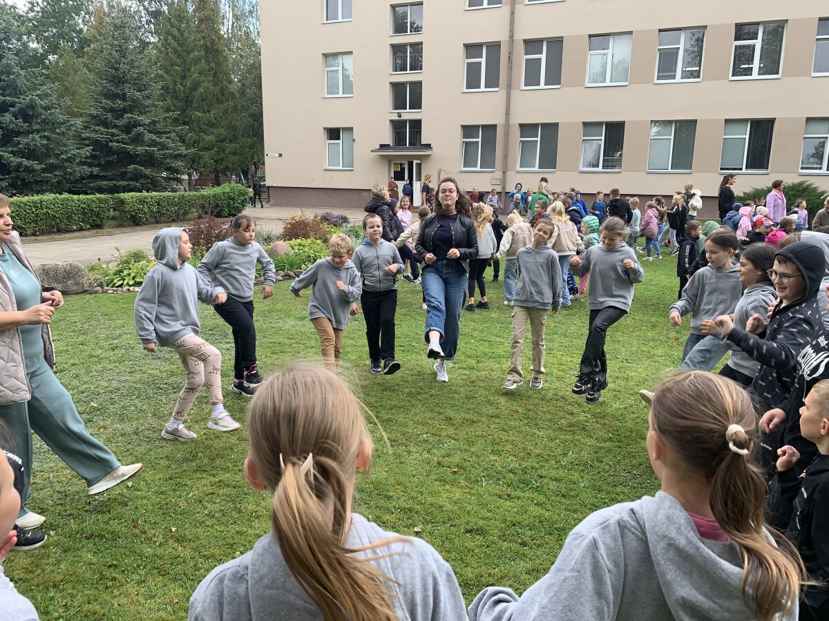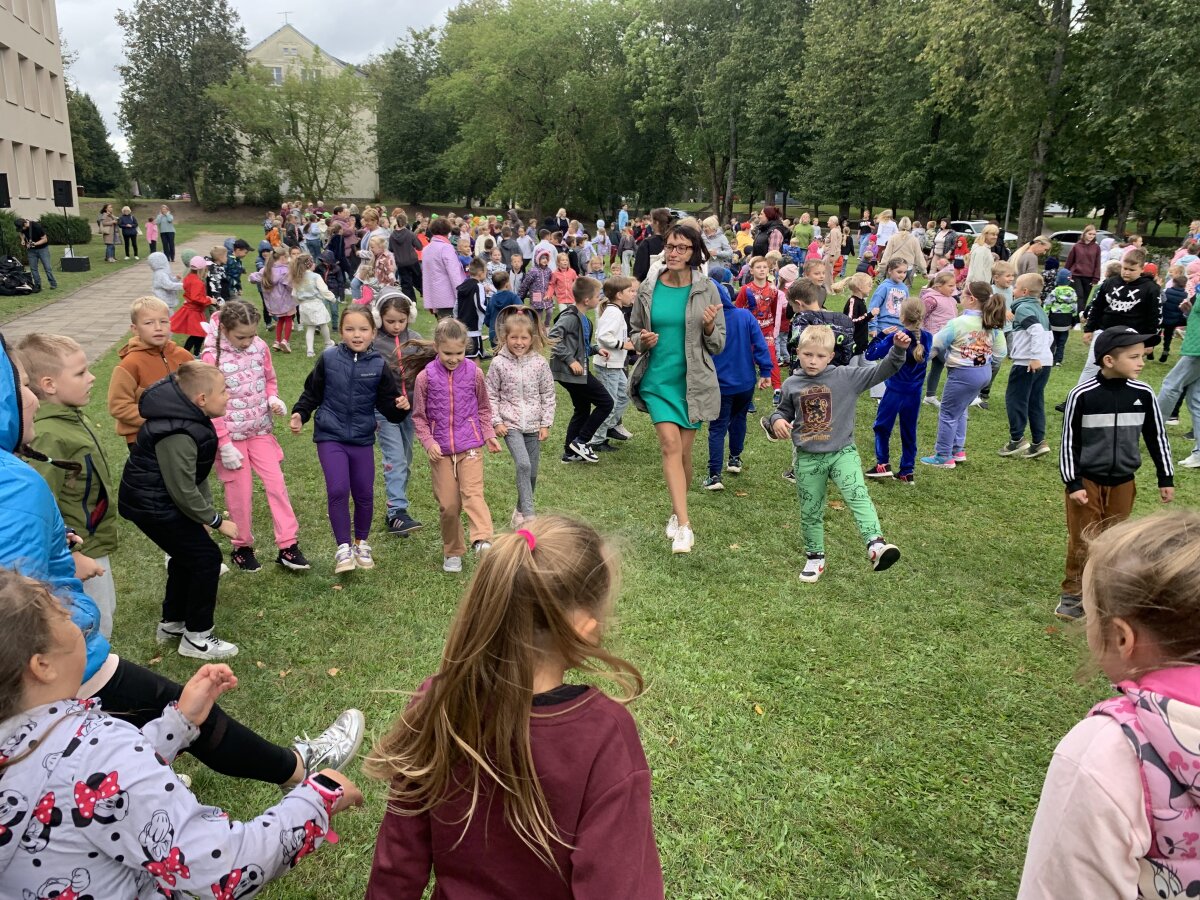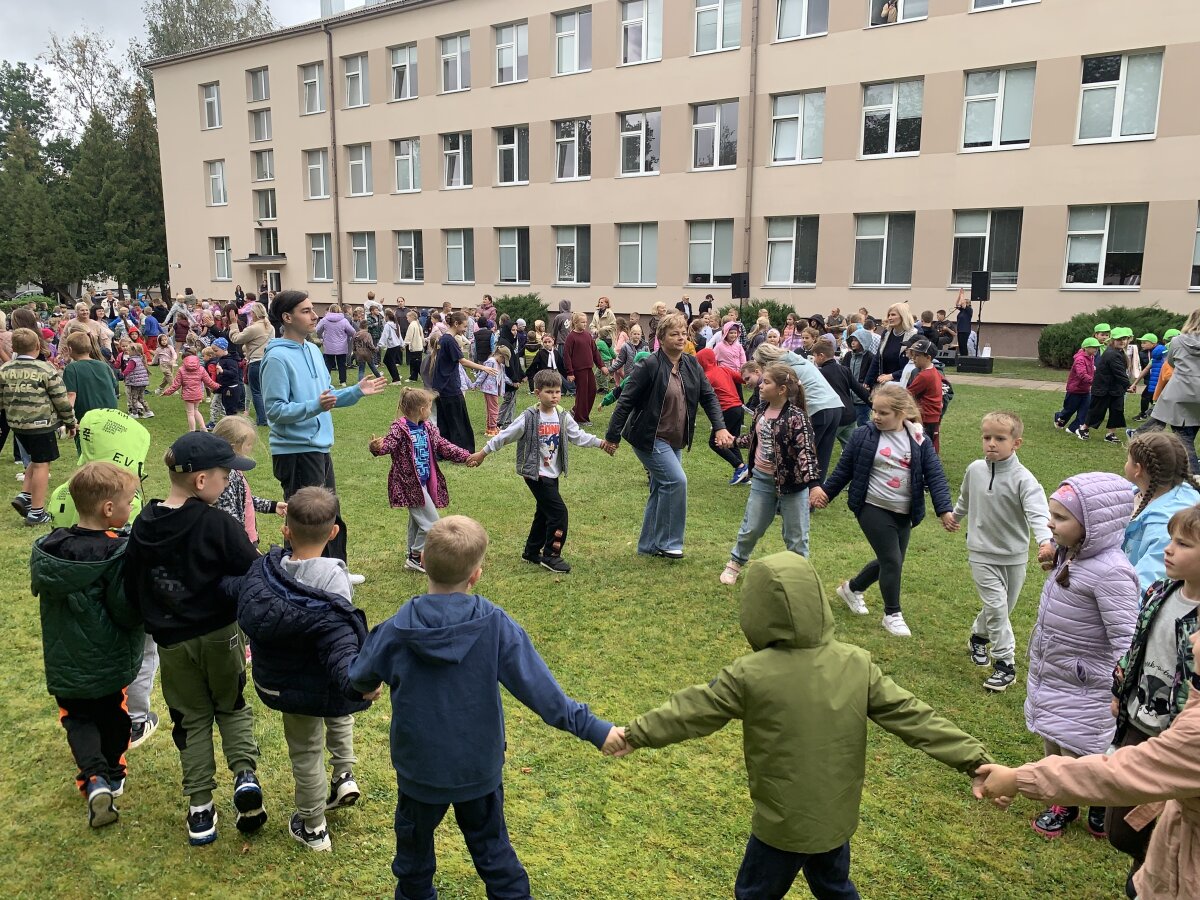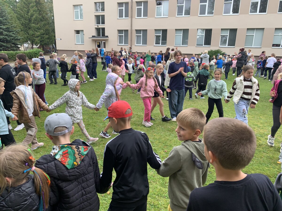 Nors dangų retkarčiais gaubė debesys, mūsų šventės nuotaika buvo tokia šviesi, kad apšvietė visą kiemą! Prie mokyklos į šokio sūkurį sukosi daugybė ratelių – nuo smalsių pirmokėlių iki vyriausių klasių mokinių, nuo mokytojų iki administracijos darbuotojų. Visi drąsiai jungėsi prie bendro ritmo ir mėgavosi judesio džiaugsmu.