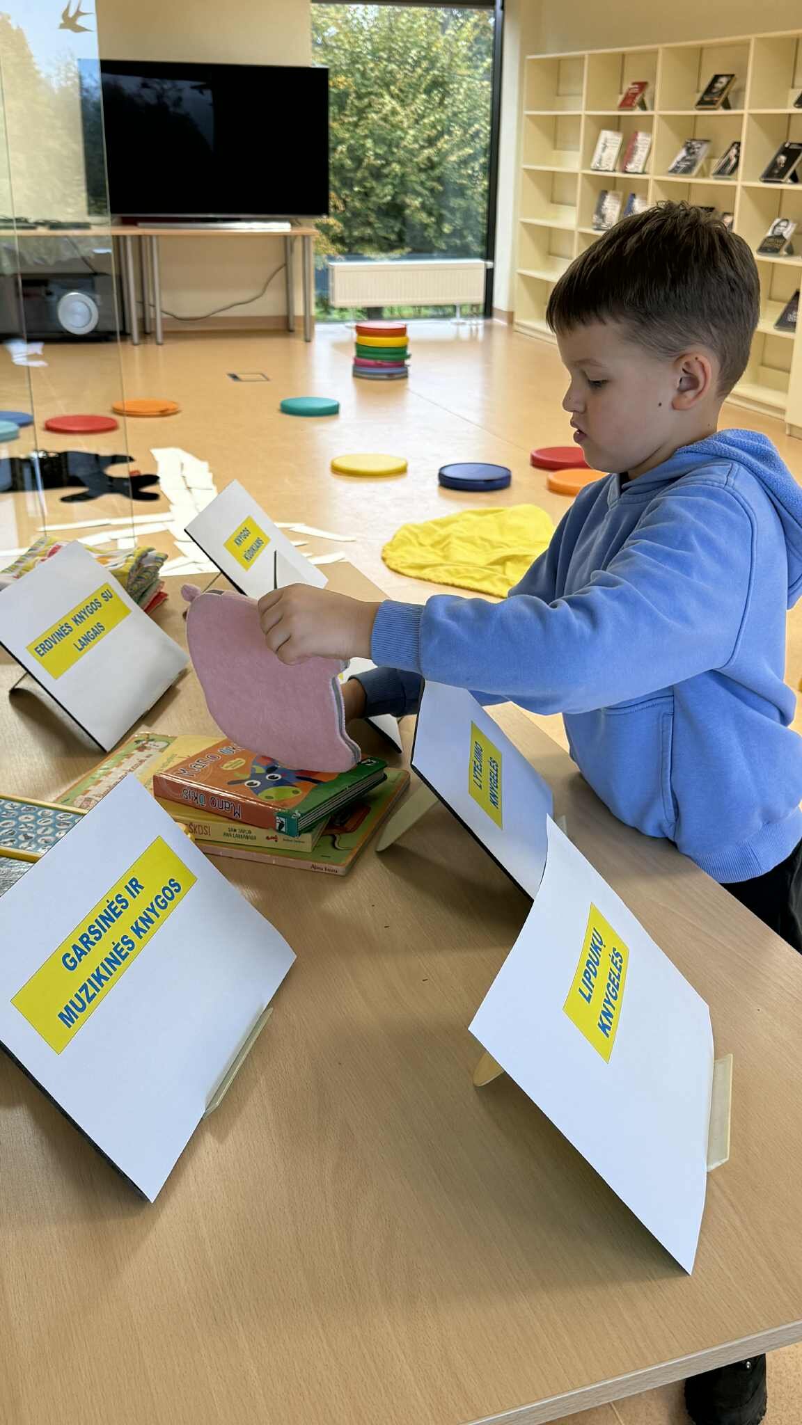 Galiausiai vyko praktinė veikla – iš „knygų piramidės“ vaikai rinkosi leidinius ir skirstė juos į krūveles prie atitinkamų užrašų, pavyzdžiui: „Erdvinės knygos“, „Dėlionių knygos“, „Garsinės ir muzikinės knygelės“ ir kt. Tokiu būdu mokiniai praktiškai susipažino su įvairių rūšių knygomis, ugdė pastabumą ir kruopštumą.