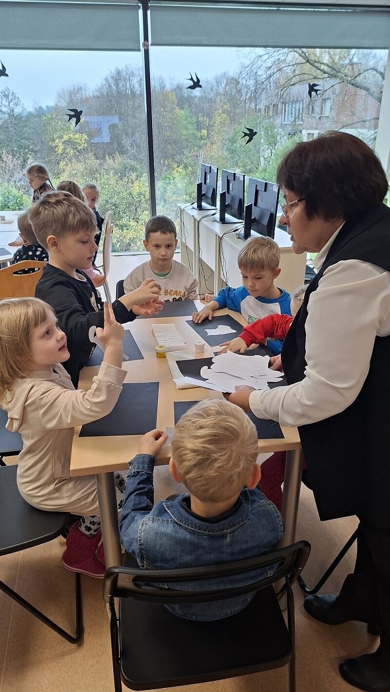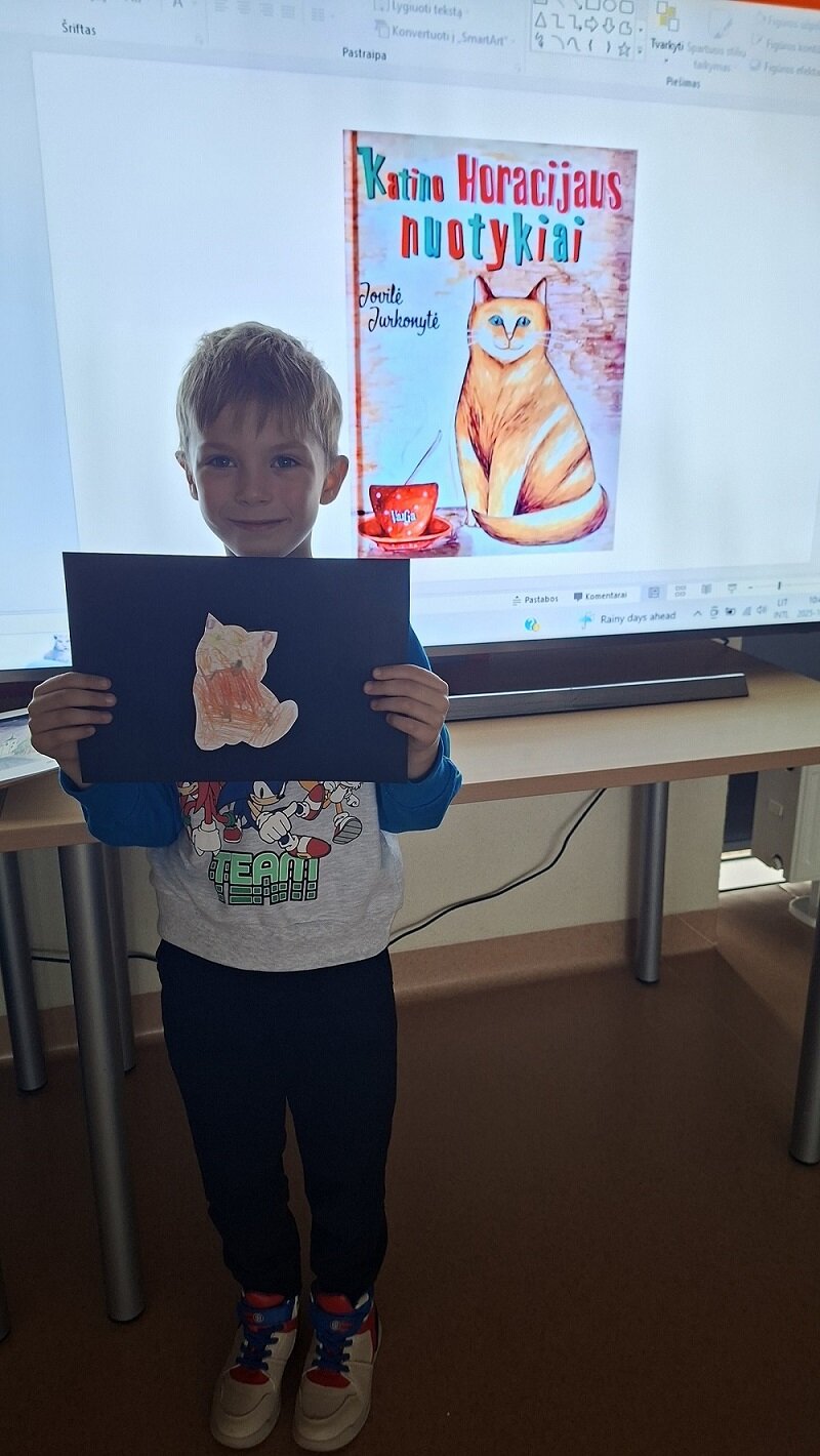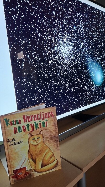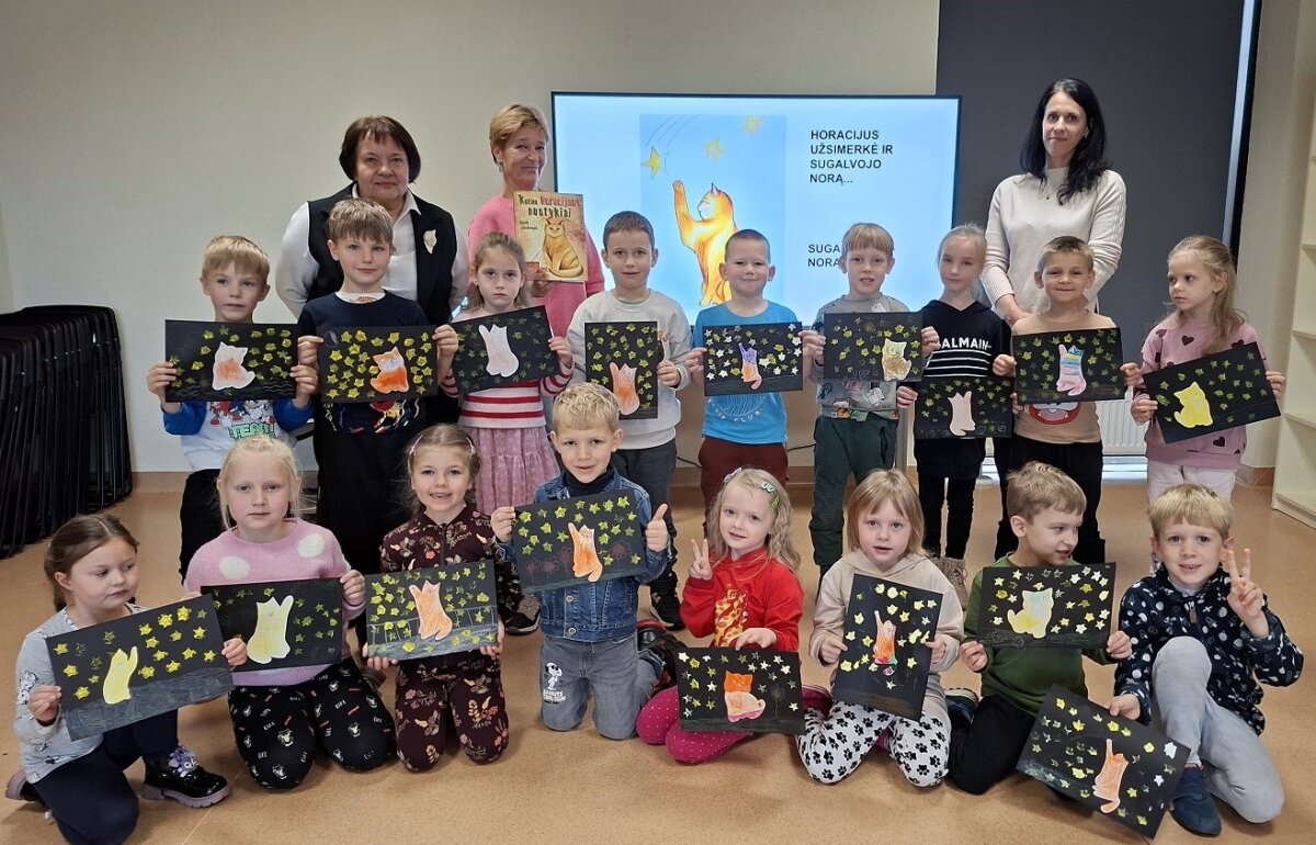 Vaikai klausėsi Jovilės Jurkonytės knygos „Katino Horacijaus nuotykiai“ ištraukos. Mažieji sužinojo, kad katinas Horacijus gyveno Vilniuje, mėgo vaikščioti po miestą, užeidavo į kavines, kur jį visi mylėjo ir vaišindavo skanėstais. Vieną vakarą katinas tupėjo ant tilto ir stebėjo krintančias žvaigždes. Jis labai troško nukeliauti prie jūros, tad pamatęs krintančią žvaigždę, tikėjo, kad jo noras išsipildys.