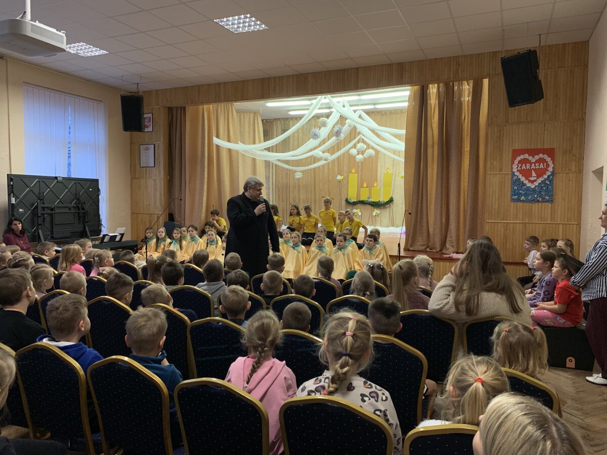 Adventinį renginį mokiniams padėjo parengti tikybos mokytoja Aurelija Jakutienė, muzikos mokytoja Diana Skvarčinskaitė ir šokių mokytojas Andrius Meškauskas.