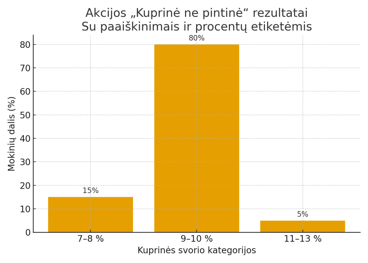 Pagal sveikatos specialistų gaires, kuprinės svoris neturėtų viršyti 10 % mokinio kūno masės. Iš rezultatų aiškiai matyti, kad dauguma mokinių šios taisyklės laikosi, o tai leidžia džiaugtis gerais įpročiais.
