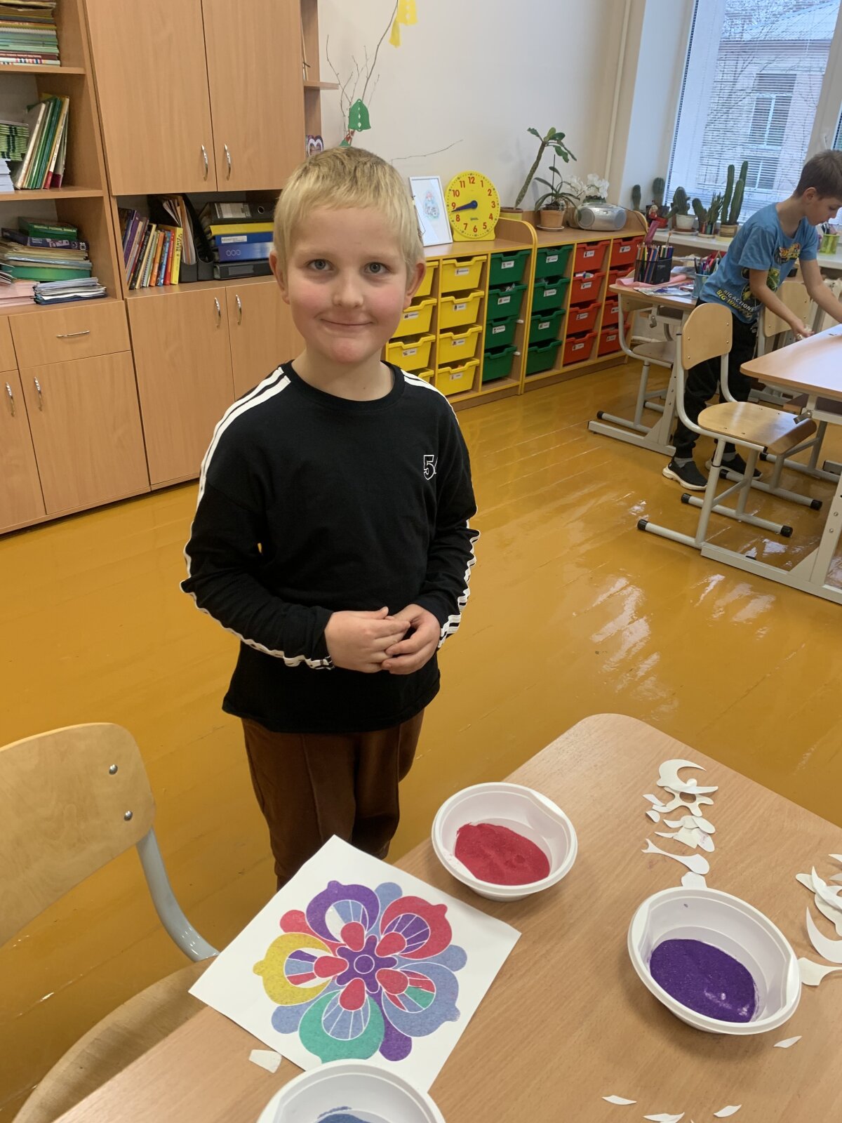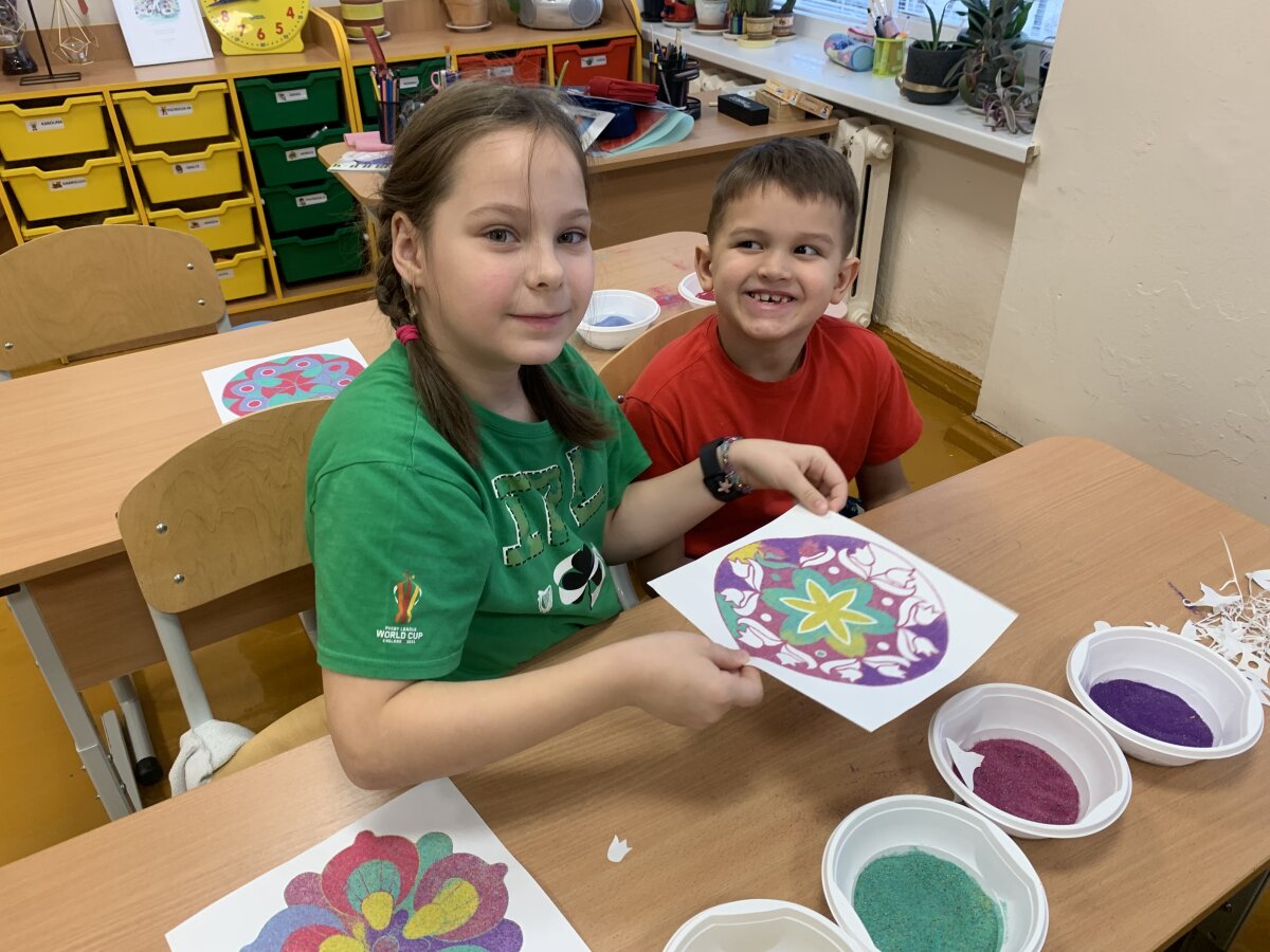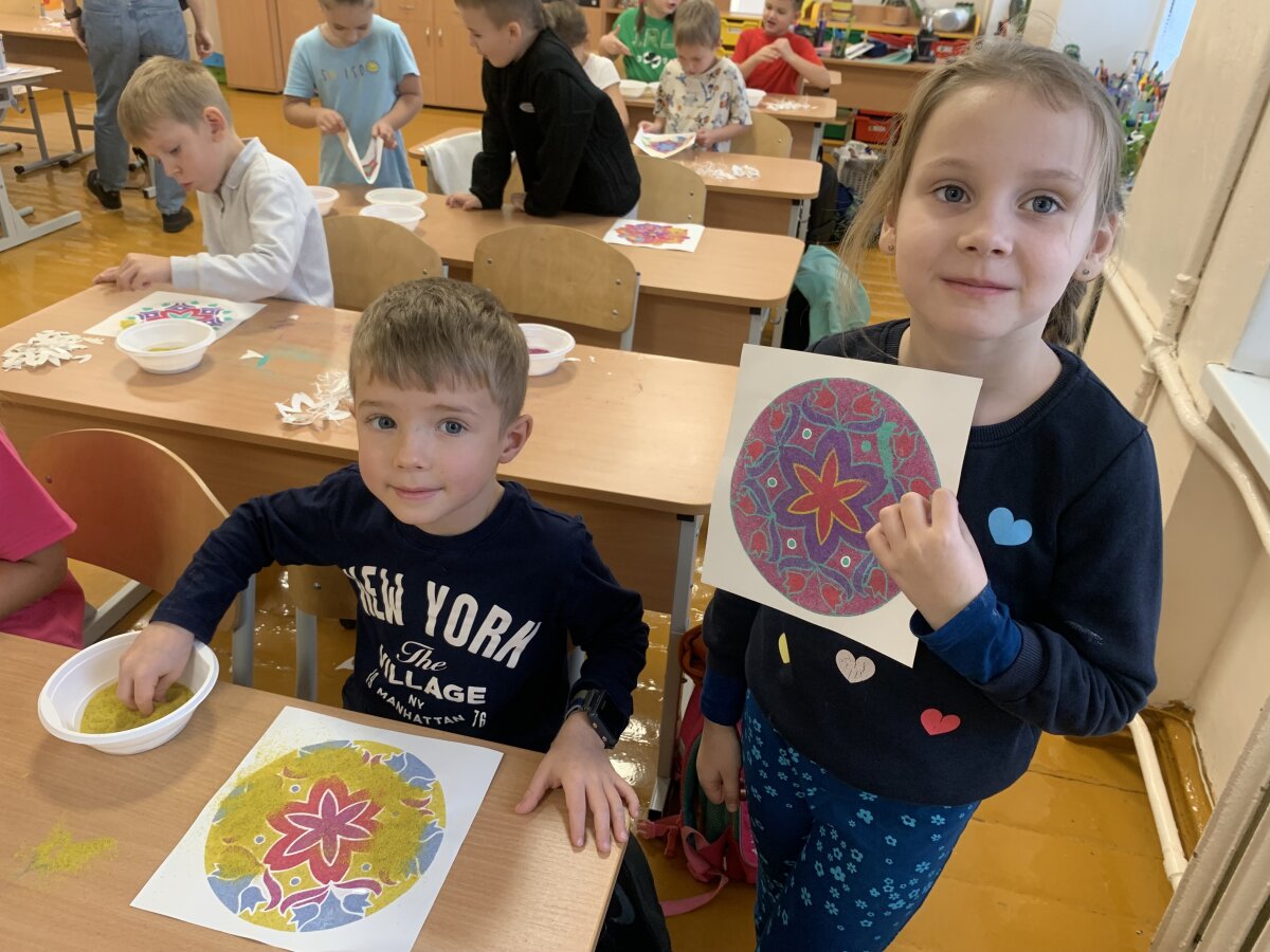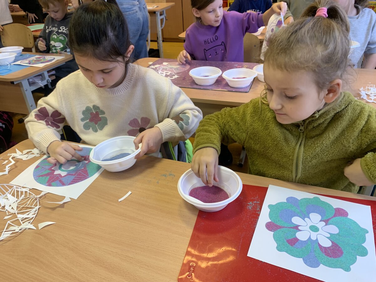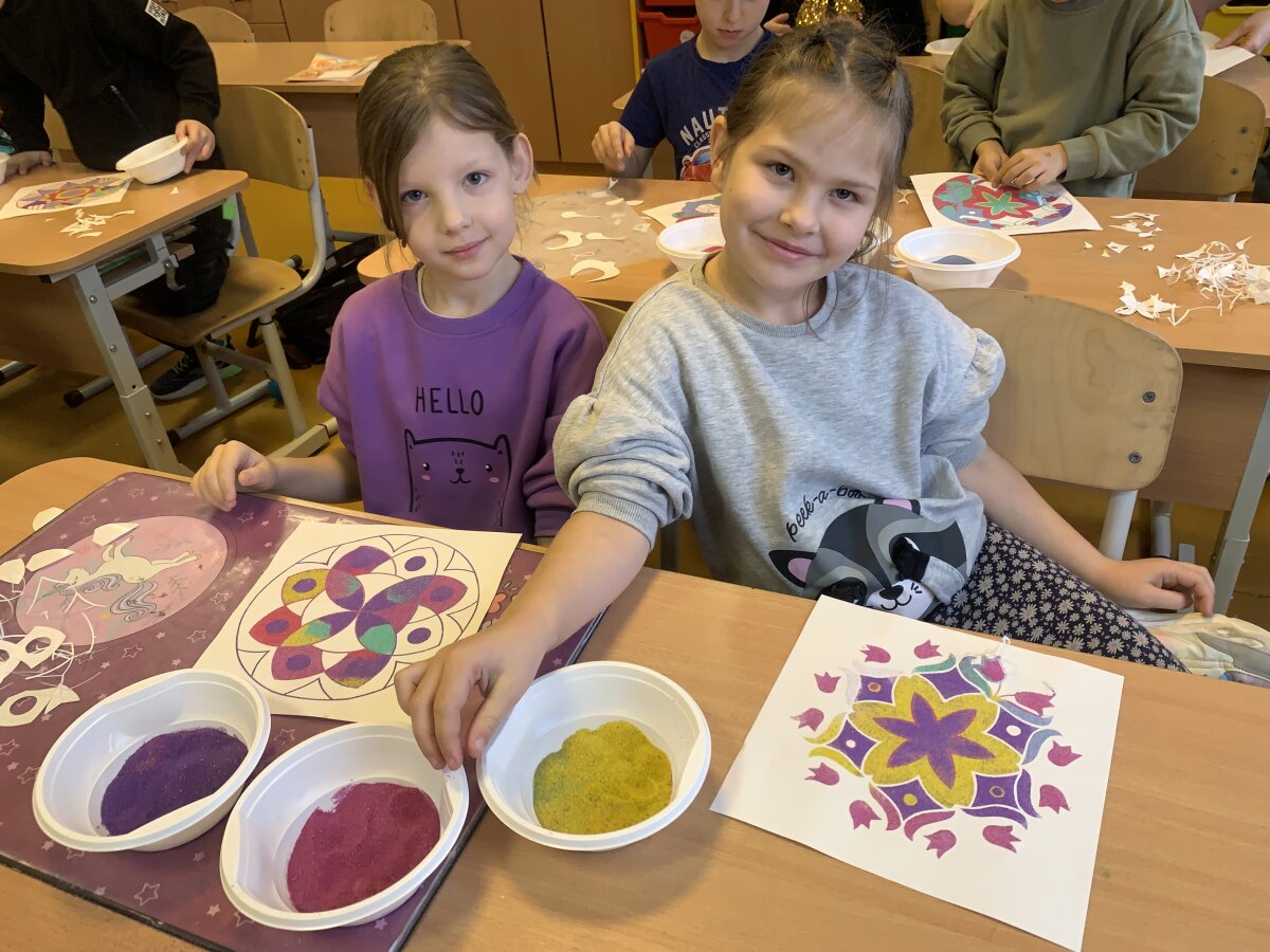 Smagiausia dalis – spalvoto smėlio terapija! Mažieji kūrėjai galėjo laisvai reikšti savo emocijas, mintis ir nuotaikas, paversdami jas spalvotais raštais. Kol skambėjo raminanti muzika, klasėje tvyrojo susikaupimas, šypsenos ir kūrybinė magija. Edukacija finansuota Kultūros paso lėšomis.