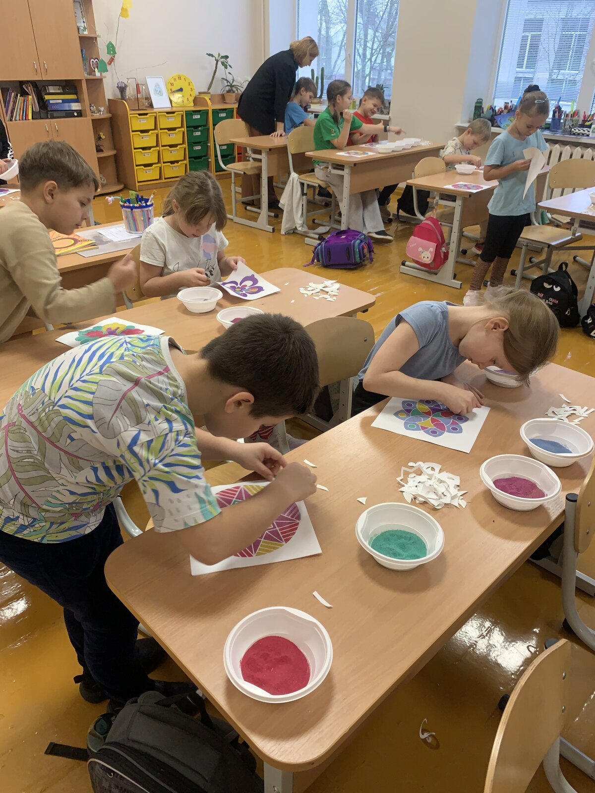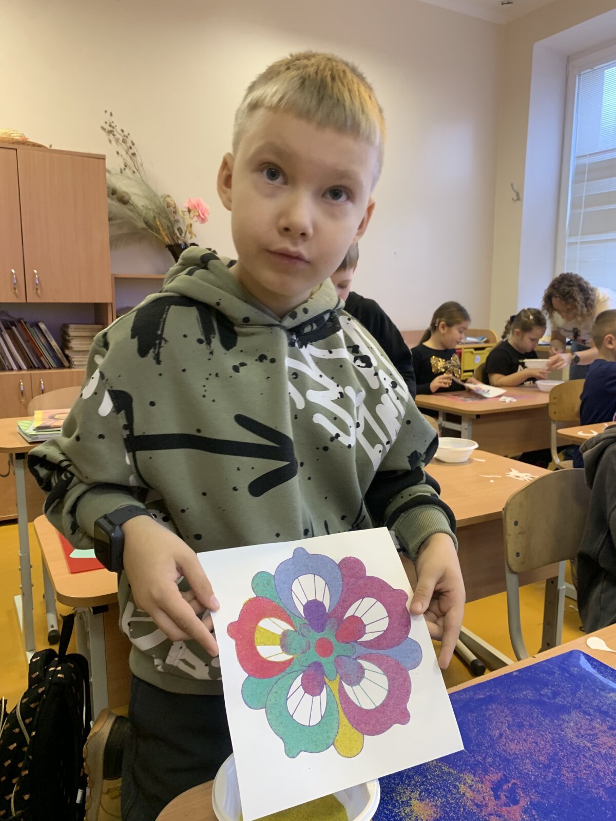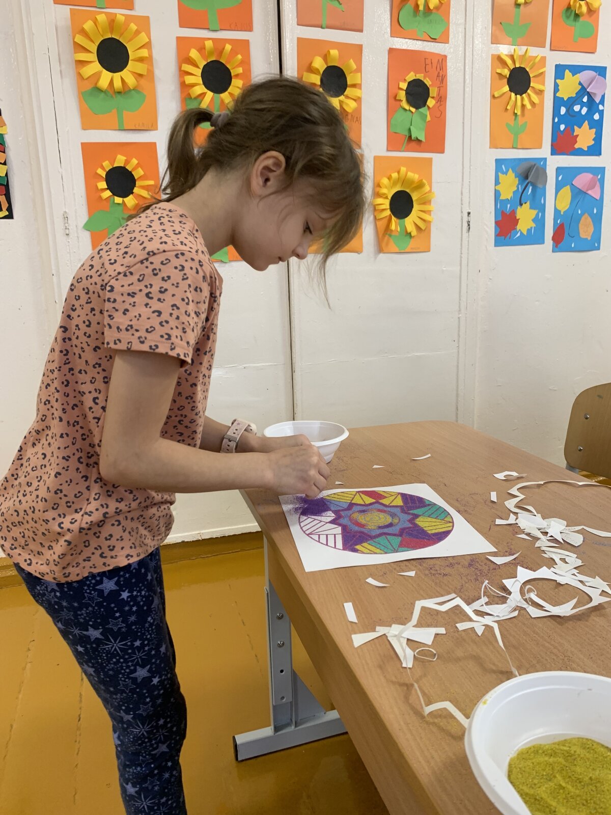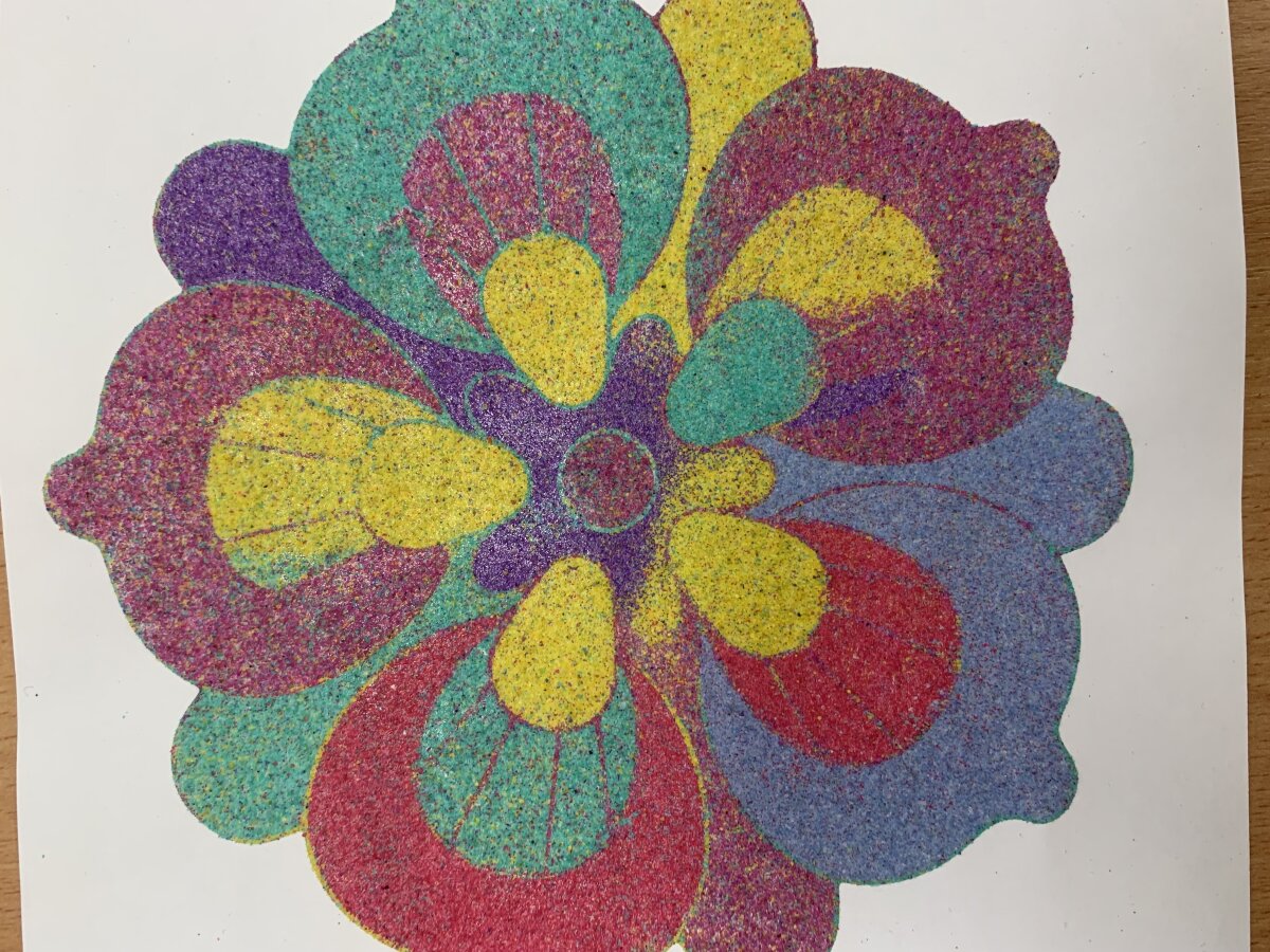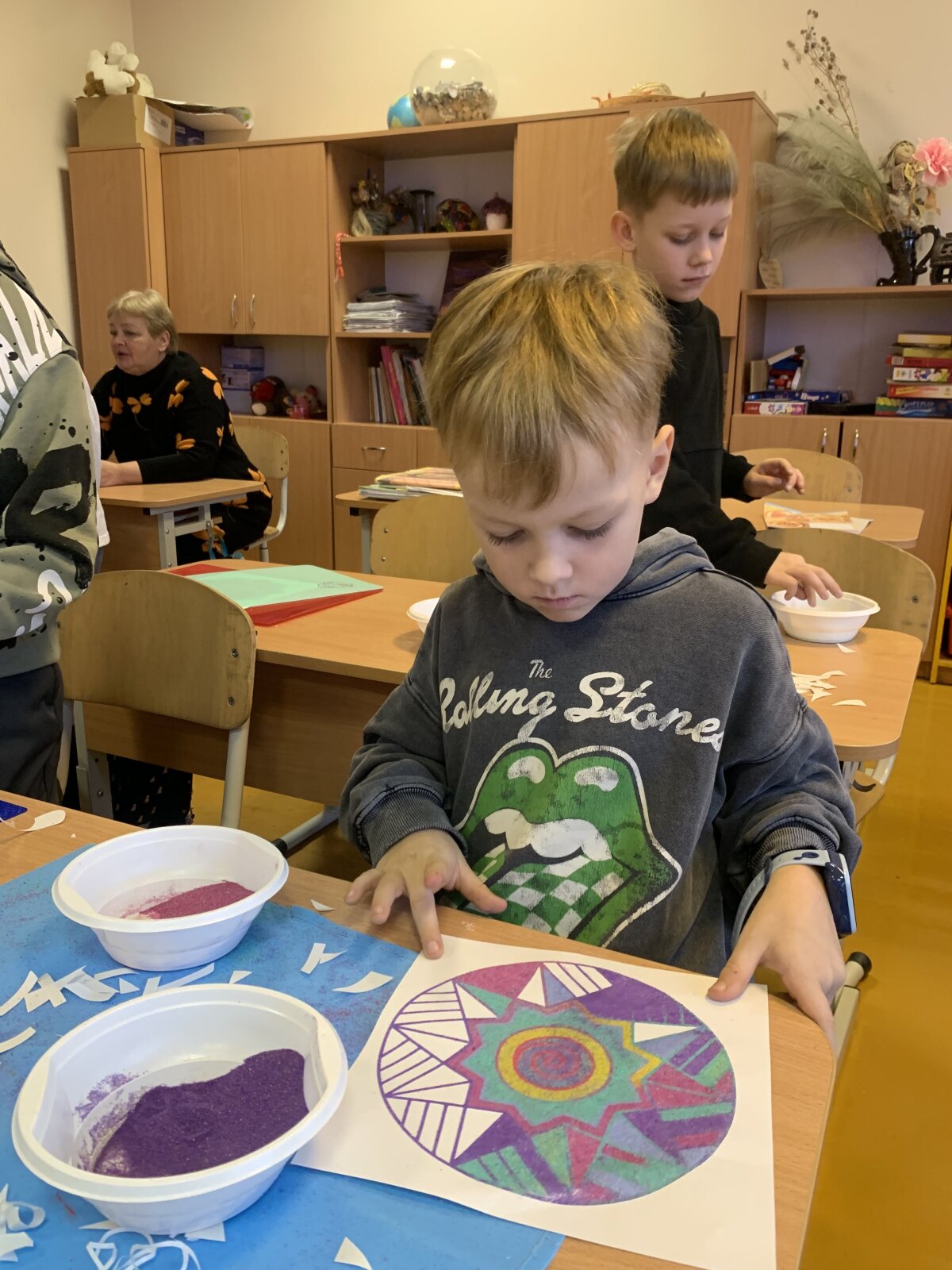 Smagiausia dalis – spalvoto smėlio terapija! Mažieji kūrėjai galėjo laisvai reikšti savo emocijas, mintis ir nuotaikas, paversdami jas spalvotais raštais. Kol skambėjo raminanti muzika, klasėje tvyrojo susikaupimas, šypsenos ir kūrybinė magija. Edukacija finansuota Kultūros paso lėšomis.