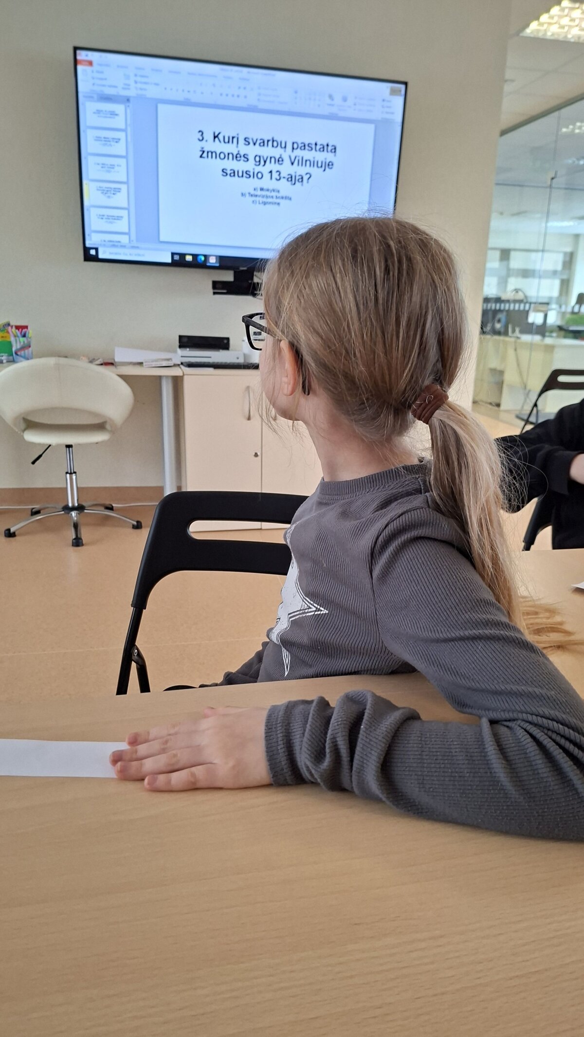 Vėliau mokiniai žiūrėjo filmuką pagal Vytauto V. Landsbergio pasakojimą „Sausio sniegenos“, pasakojantį apie to meto nuotaikas ir Loretos Asanavičiūtės drąsą. Po peržiūros vyko viktorina apie Tėvynę, Laisvę ir Sausio 13-osios prasmę.